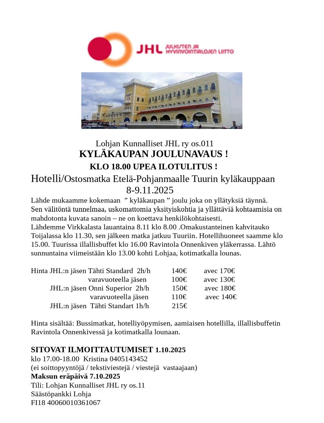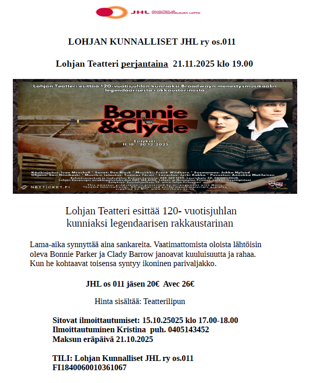 Yhdistyksemme huvi- ja vapaa-aikatoimikunta järjestää noin 7 kertaa vuodessa erilaisia tapahtumia tai matkoja. Tiedot järjestettävästä toiminnasta julkaistaan tällä sivulla ja yleensä myös yhdistyksen Facebook-sivulla. Lähetämme myös sähköpostia, joten onhan osoitteesi ajan tasalla omaJHL:ssä?